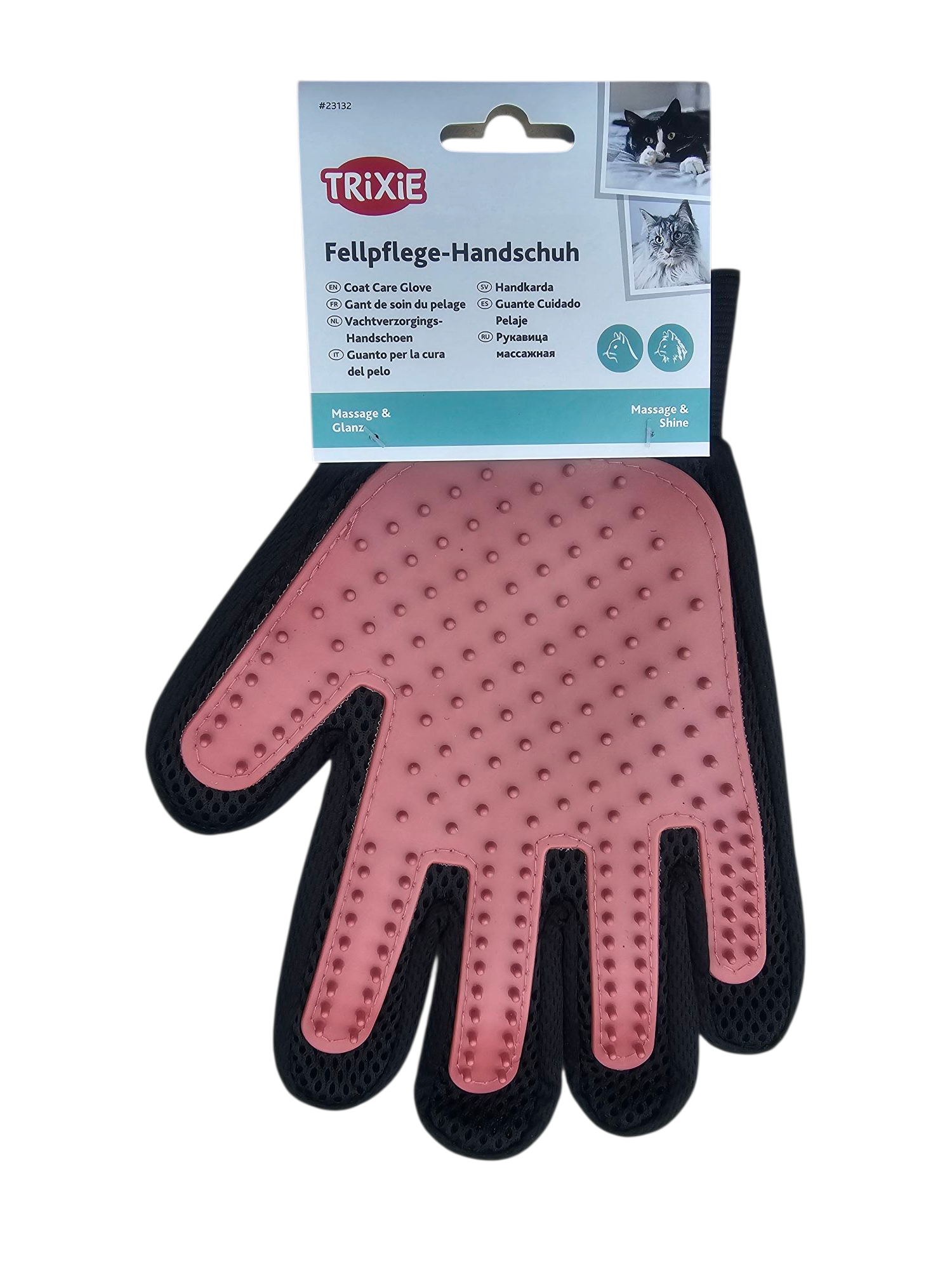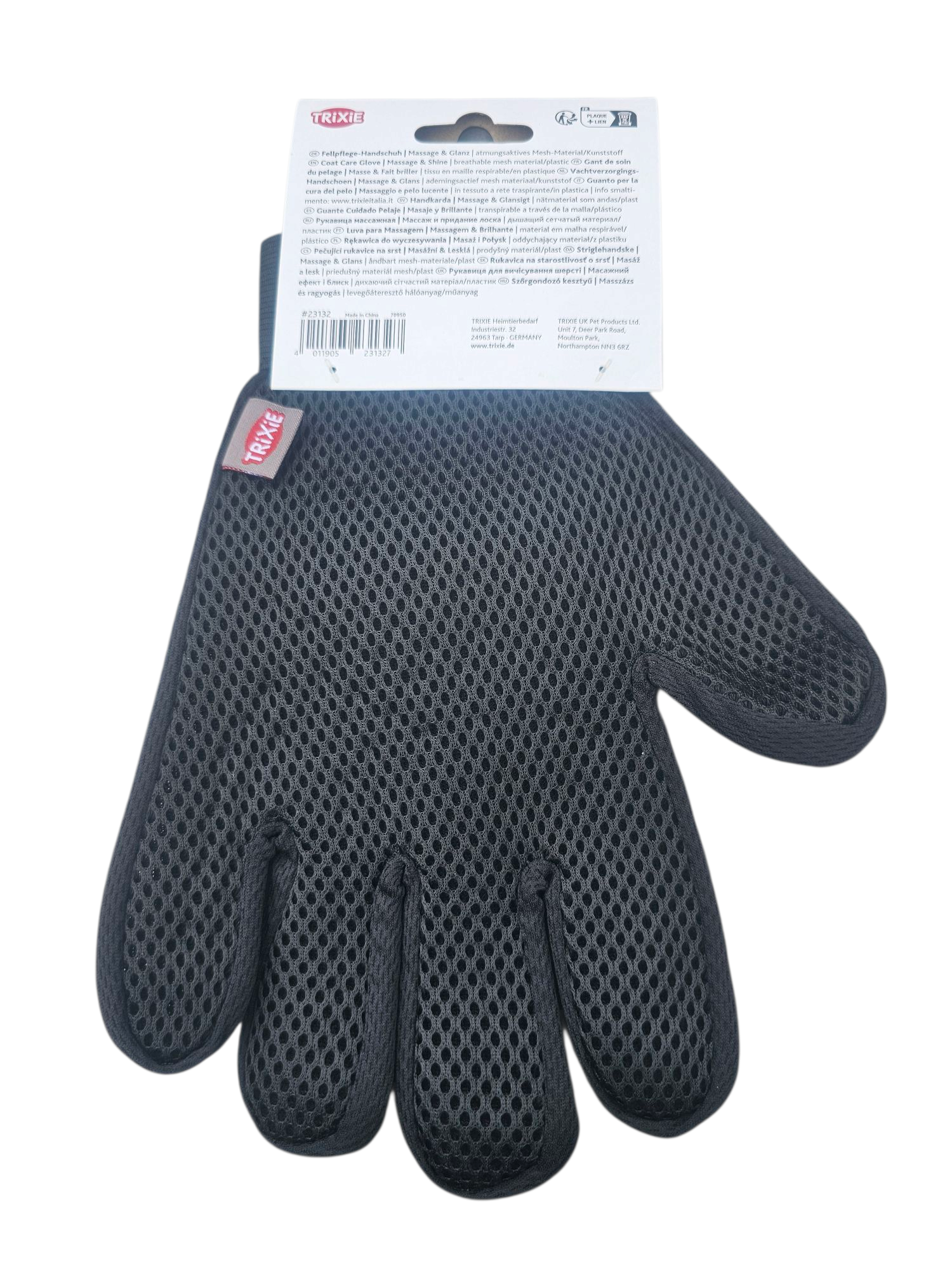 Met de trixie verzorgingshandschoen wordt de vacht van uw hond verzorgen makkelijker dan ooit tevoren! De kamzijde verwijdert in een handomdraai overtollig haar en stof en geeft de vacht een zijdezachte glans. Daarnaast zorgt de structuur van de handschoen voor bevordering van de doorbloeding. Ook voor de baas is de handschoen comfortabel; het mesh-achtige materiaal is ademend en zorgt zo voor hoog draagcomfort en de klittenbandsluiting zorgt voor en goede pasvorm.